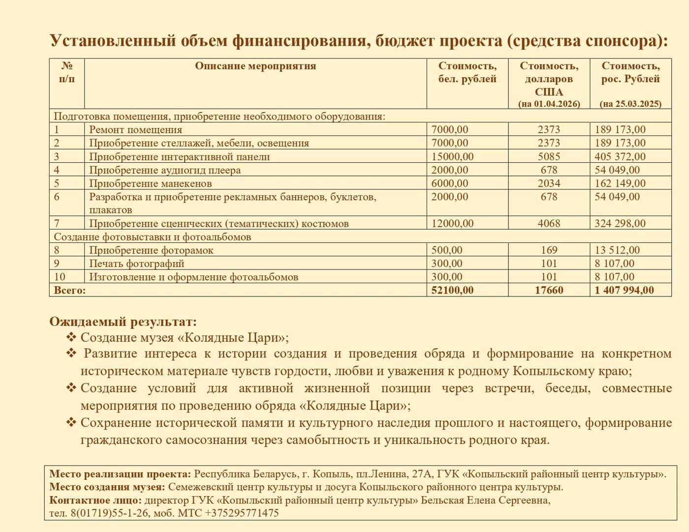 ФИНАНСИРОВАНИЕ ПРОЕКТА: Административные и прочие расходы за счет собственных средств районного центра культуры. ОЖИДАЕМЫЙ РЕЗУЛЬТАТ: